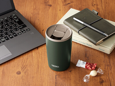 保温力を高めるフタ付きのタンブラー。ホコリも入らないのでオフィスでマグカップ代わりに使うのもおすすめです。フタは回転開閉式でストローも挿しやすく、分解して隅々まで洗えるのでいつも清潔に使えます。