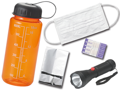 ウォーターボトル(満水容量690ml)・懐中電灯・防寒用アルミシート・マスク・救急絆創膏