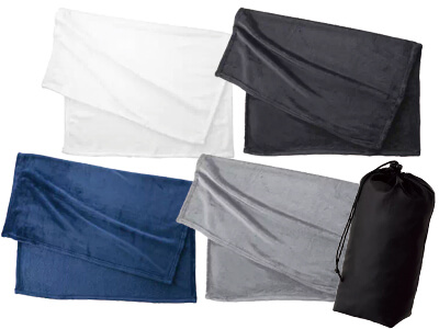 キャンプなどアウトドアにも持ち出しやすい巾着付きブランケット。あったかい起毛仕様です。一般的なノベルティのブランケットより一回り大きいサイズで、ひざ掛け用にぴったり。