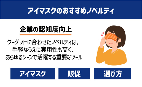 展示会やキャンペーンで「実用的で喜ばれるノベルティ」を探している担当者の方、必見です!睡眠やリフレッシュに役立つアイマスクは、旅行や出張が多いビジネスマンから、日常的にリラックス時間を大事にする人まで、幅広い層に人気のアイテムです。