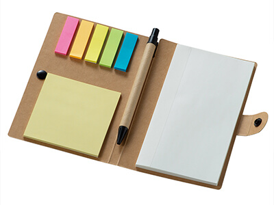 ペン付きのノートと付箋セット。ホックで留めることができるのも嬉しいポイントです。セミナーの参加プレゼントなどにもおすすめです。