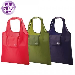 再生素材を使用した環境にやさしいエコバッグ。携帯時はポケット部分に小さく収納でき、使用時は肩掛けもできる使い勝手の良いショッピング用バッグでレジ袋削減にも一役買います。