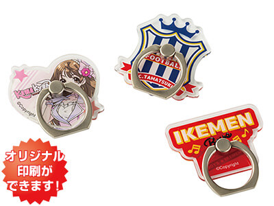 スマートフォンの裏面に貼るだけのスマホリング。落下防止やスタンドにもなる便利なアイテムです。ダイカット形状で自由にデザインができ、フルカラー印刷にも対応可能。同人グッズやノベルティにおすすめです。