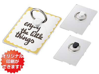 大きめのモバイルリングホルダー。大型のスマホにも対応しやすい形状で、持ちやすい位置に配置できます。フルカラーで印刷でき、キャラクターなどをプリントすることも可能です。