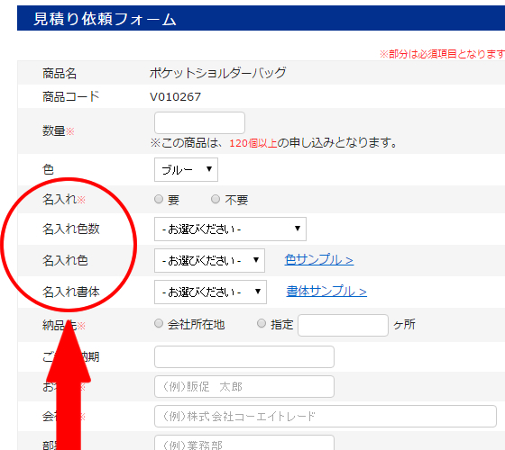 商品詳細画面の見積り依頼フォームに、この項目が表示されていれば名入れ可能です。