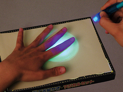 | 商品概要 | ペンシル型のブラックライトを蓄光シールに照射し、絵を描いたり影をつけたりする科学キットです。 ブラックライトで照らすと文字や絵が浮き出る特殊インクを使用したマジカルライトペンが付属しています。 蓄光シールは貼ってはがせる弱粘着タイプですので、壁などに貼り付け可能です。 |