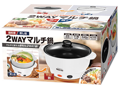 | 商品概要 | 蒸し料理も鍋料理もお任せ。1台2役の2WAYで使える便利な調理鍋です。インテリアになじむシンプルなデザインで、新生活のギフトなどにおすすめです。 ■セット内容:ガラス蓋、電源コード、せいろ ■電源:AC110V-540W |