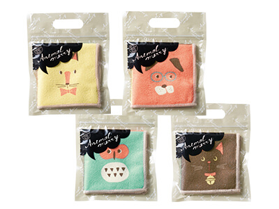 | 商品概要 | ファンシーなアニマルキャラクターがデザインされたハンカチタオル。おしゃれな手提げパッケージでそのままお渡しできます。ショップのオープン記念や購入お礼などにぴったりです。 |