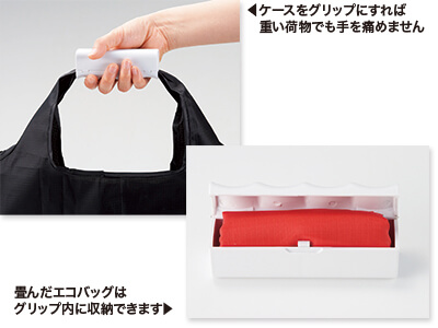 | 商品概要 | 携帯用ケースがグリップになる機能的なエコバッグ。持ち手が手に食い込むことがないので、重たい荷物も楽に持ち運べます。ケースは指にフィットする凹凸のついた握りやすいデザイン。たたんだエコバッグはケースに収納できるので携帯しやすさも魅力です。 ※レッドは好評につき完売しました。 |