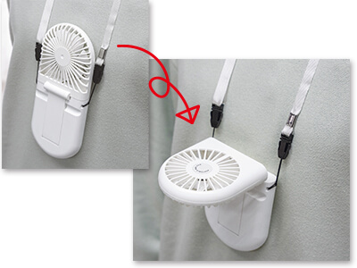 | 商品概要 | 暑い日の必需品として人気の小型扇風機。ネックストラップが付いているので首に掛けることができ、両手が空くのでアクティブなシーンにも便利です。スタント付きで、デスクに置いても使うことができます。白のボティが名入れを引き立てるので、カラー印刷でキャラクターなどを入れるのもおすすめです。 ■電源:USB ■付属品:充電ケーブル付(Type-C)、ストラップ |