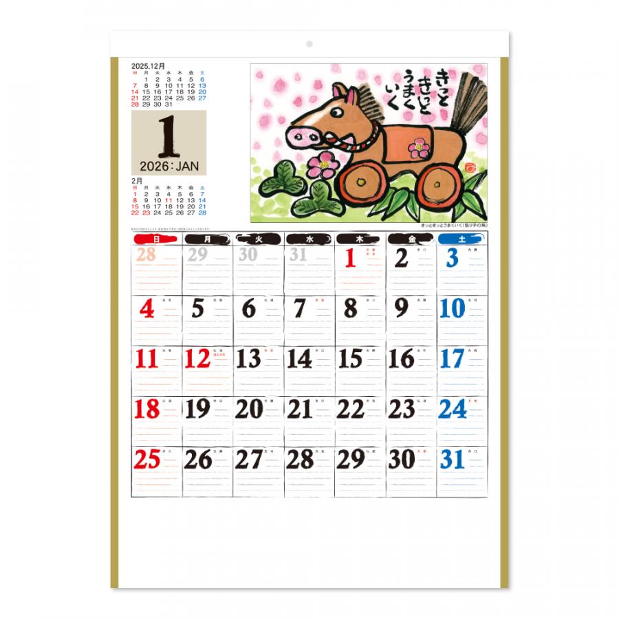 | 商品概要 | 絵手紙のような優しく温かみのあるイラストが特徴的なカレンダー。メモ欄に罫線が入っているでスケジュールも書きやすく、先月と来月も見ることができるのでスケジュールの把握もラクチンです。 ※印刷色は基本色からお選び下さい。 ■日本製 |