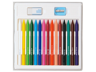 | 材質 | ケース・中仕切:PP、台紙:紙、色軸:顔料・体質顔料・ワックス・樹脂、削り器:PS、刃:鉄、消しゴム:エラストマー、名前シール:紙 |