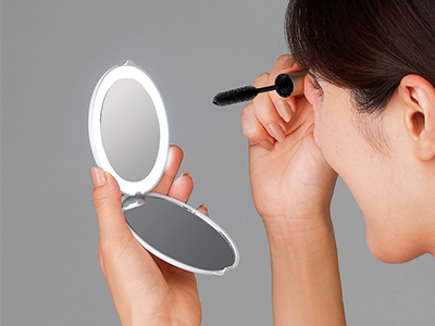 | 商品概要 | 等倍鏡と拡大鏡、2種類の鏡がセットされたコンパクトミラー。メイクをするときやコンタクトレンズの確認にも便利です。スイッチを押せば等倍鏡の周りにLEDライトが点灯するので、暗がりでも使えます。 ■電源:ボタン電池×2(別売) |