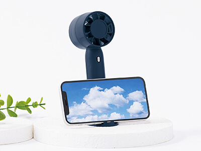 | 商品概要 | 風が当たりやすい傾斜付きのハンディファン。台座をつけることで卓上でも使え、台座にはスマホスタンドも付いています。 ■電源:単4乾電池×2本(別売) |