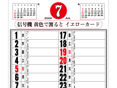 | 商品概要 | 使いやすいサイズと見やすい日付、書き込みのしやすいメモスペースに交通標語をあしらった実用的なカレンダーの定番です。 ■印刷色:黒、赤、藍、緑よりお選びください。 |