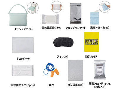 | 商品概要 | 身近に備えてすぐに使える!防災セット付マイクロビーズクッションです。 天面のチャックを開けると防災セットが入るポケットがついており、基本的なアイテムがセットされています。手提げのように持ち運べる紐付きで、いざという時にサッと持ち出せるのもポイント。また、避難時にはクッションを寝具代わりにも使えます。社員備品や防災キャンペーン品などにおすすめの商品です。 ■セット内容:マイクロビーズクッション、EVAポーチ、携帯トイレ、携帯トイレ付属ごみ袋、アイマスク、耳栓、ポリ袋、ウェットティシュ、アルミブランケット、圧縮タオル、マスク、防災ガイド |