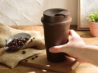 | 商品概要 | コーヒーの豆かすを再利用したアップサイクルのタンブラー。本来廃棄されるはずの、コーヒーを抽出した後に残る豆かすを使用することで、廃棄物の削減や合成樹脂の使用量を抑えた環境に優しい商品です。SDGs関連のイベントやグッズとしてもご提案ください。 ■容量:400ml |