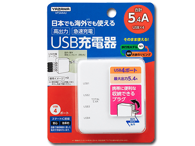 | 商品概要 | 自動で接続機器に適した電流で充電する安心、効率的なスマートIC搭載、携帯に便利な収納できるプラグです。 ■USB出力:5.4A ■USBポート:4 |